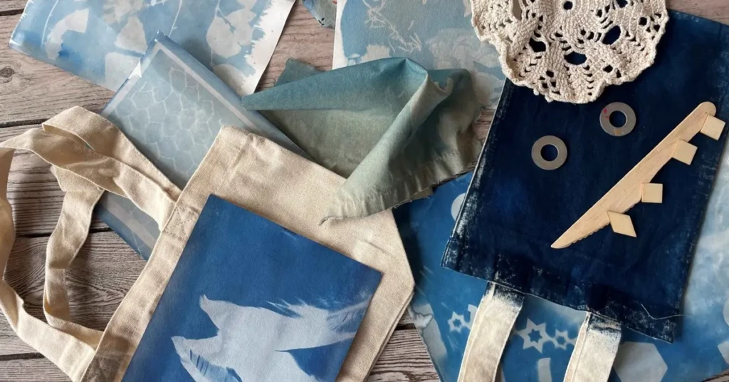 “Inspirés par les objets d’art portables présentés dans l’exposition €AT, les enfants sont invités à concevoir et personnaliser leur propre création portable. À l’aide d’une variété d’objets, de textures et de formes, ils composent des images sur un tissu traité au cyanotype.