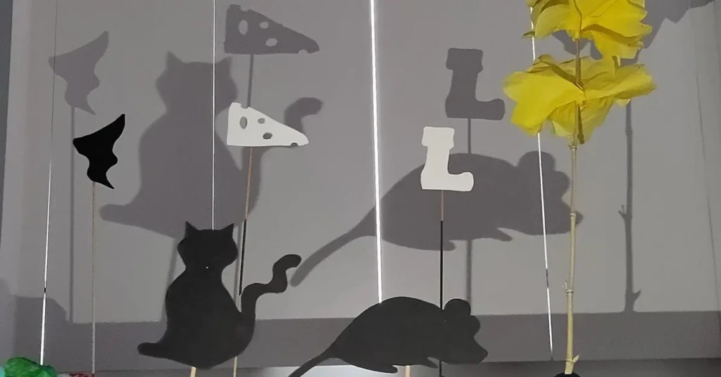 “À l’aide de papier, de ciseaux et colles et de tiges, les enfants et leurs parents créent un joyeux théâtre d’ombres.