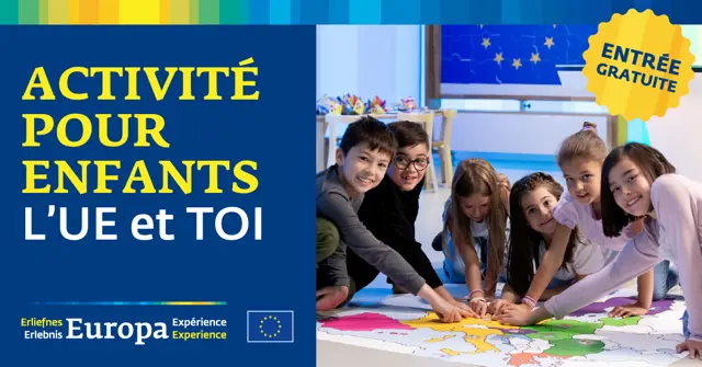 Tous les samedis, les enfants* sont invités à découvrir l’Union européenne avec des activités amusantes et interactives ! Les jeunes visiteurs pourront y voir une courte présentation dans le cinéma 360 degrés suivie de toute une panoplie d’activités pédagogiques (reconnaissance de drapeau, spécialités culinaires des 27 pays, puzzles, etc).