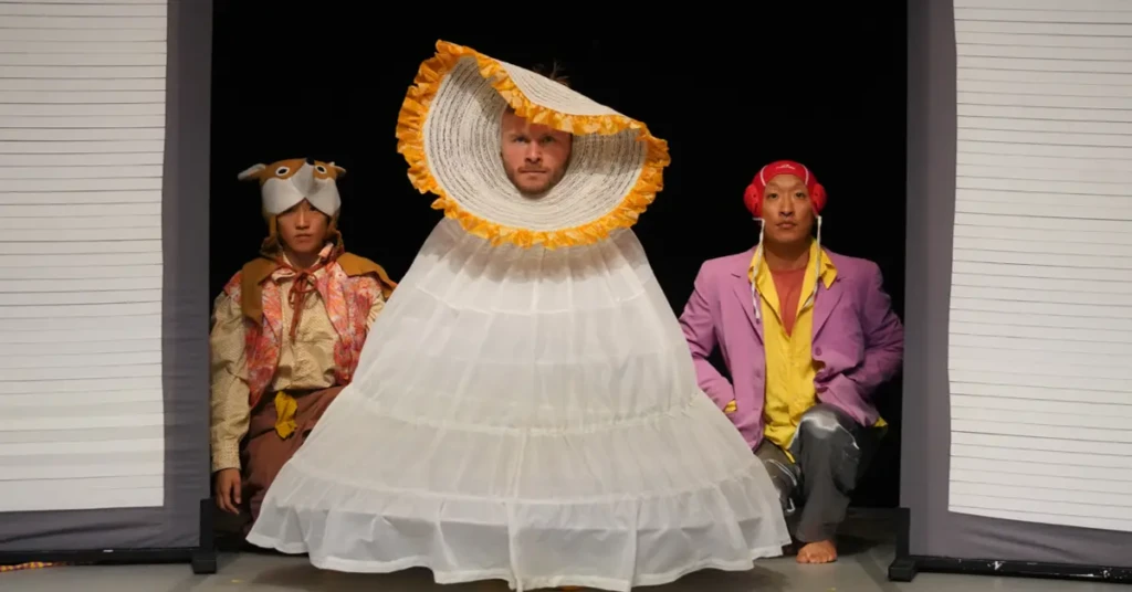 “Spiel im Spiel, c’est comme un jeu d’enfant : tout est possible, l’imagination ne connait aucune limite. Le sol devient brûlant, un tabouret devient un radeau, on a soudain quatre pieds… Mais qui décide de la suite du jeu ? Et que se passe-t-il quand quelqu’un ne suit pas les règles ?
