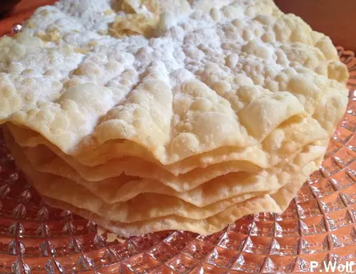 Au Luxembourg, nous avons les Verwurelter, en Suisseils dégustent des « Fasnachtsküchli », appelés « Merveilles » en suisse romande! Ces feuilles de beignet circulaires d’environ 20 cm de diamètre et extrêmement fines sont saupoudrées de sucre impalpable. On les appelles parfois Chnü-Blätze en référence à leur « façonnage » qui consiste à étirer et à aplatir la pâte sur le genou.
