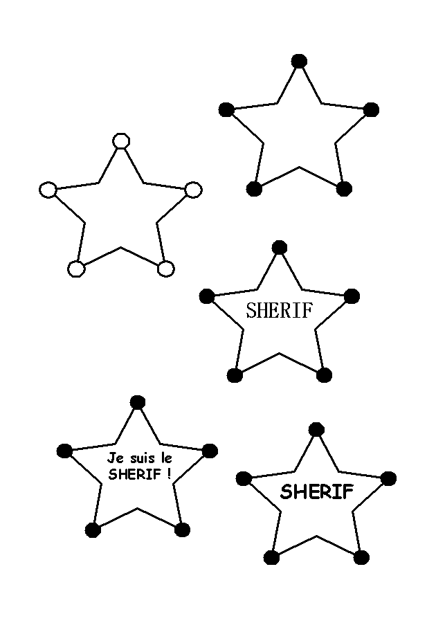 Pour le méchant cow-boy: un foulard pour se cacher le visage et se protéger lorsqu’il s’enfuit sur son cheval. Pour le courageux Shériff, les menottes et l’étoile bien-sûr ! Voici quelques modèles à imprimer.